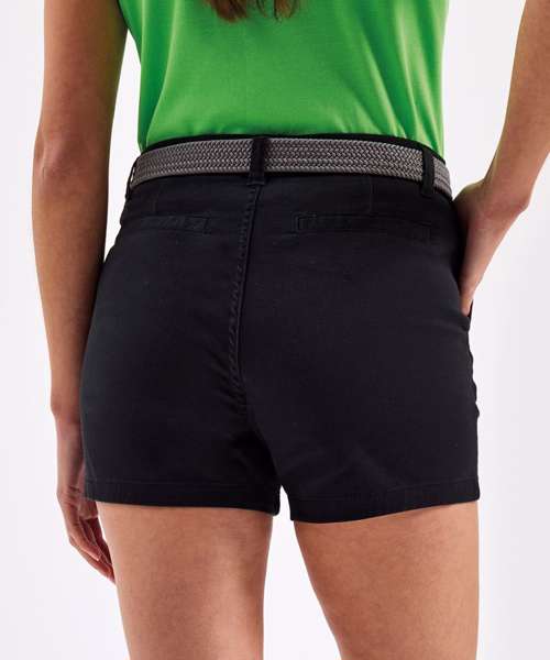 Women's classic fit shorts in a soft fabric finish. Zip fly with button fastening at waist. Belt loops. Two swing pockets to the side and back jetted pockets with button fastening. Product contains no branded neck label. Removable Kimble or looped garment tags. Inner seam label holds important product information on one label with a second label containing brand information which can be cut-away. Please note old stock may contain a fixed branded label.