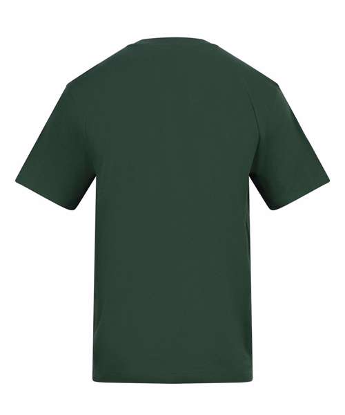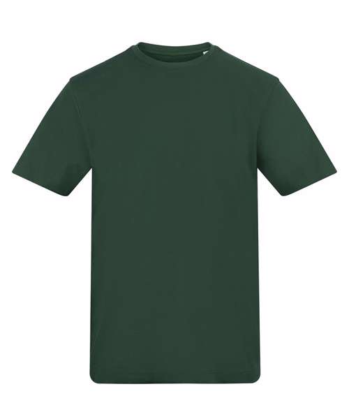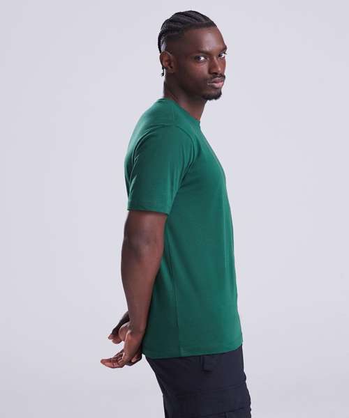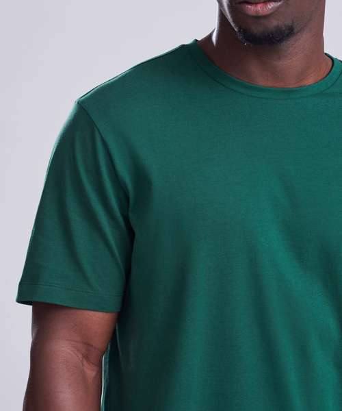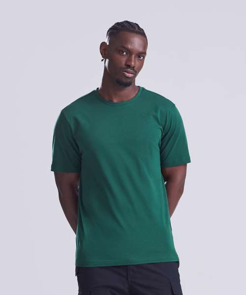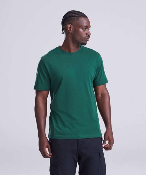 Relaxed fit T. Short sleeves. Side seams. PurePrint BC Cotton fabric. Taped back neck. Twin needle stitch details. Ribbed crew neck. Size label only for easy rebranding.