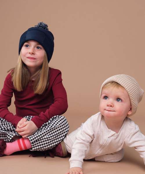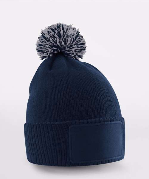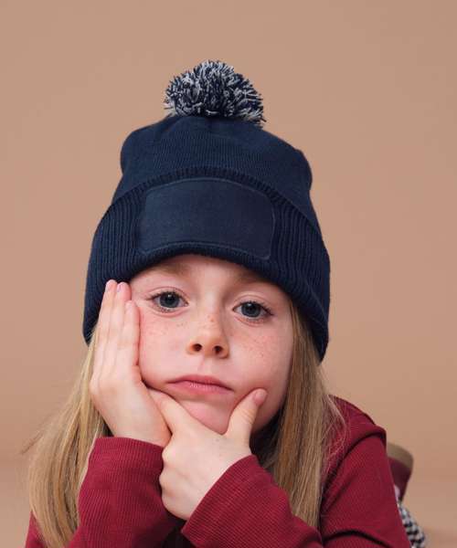 Ribbed cuff. Double-layer knit. Two-tone pom pom. Cotton twill patch for decoration. TearAway label for easy rebranding.