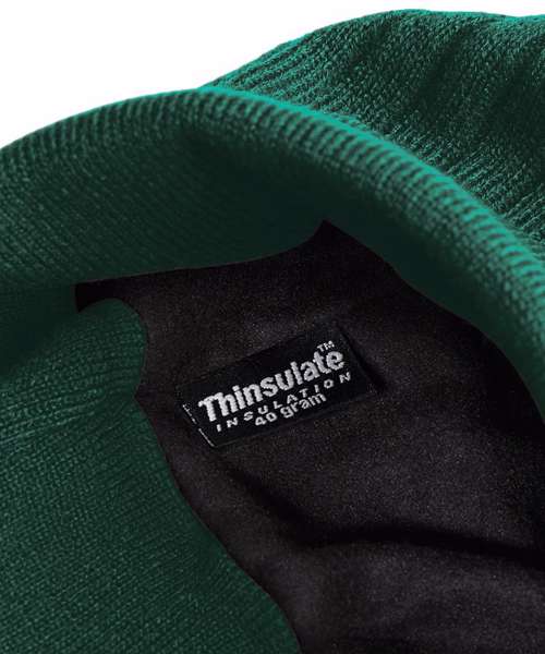 Thinsulate™ lining. Non-ribbed turn up for easy decoration. Double layer knit.
