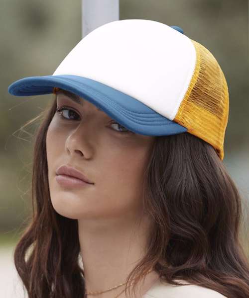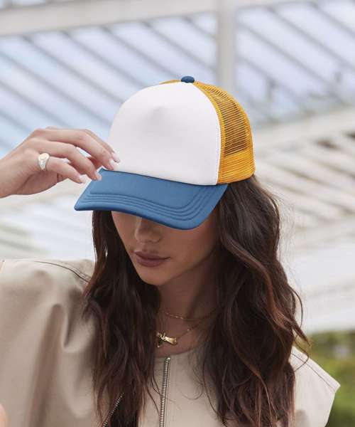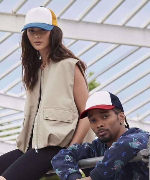 The Retro 5-panel trucker blends bold, contrast colours with a classic design. Combining comfort and sustainability, the front panel and peak are padded, with recycled polyester mesh rear panels. The 5-panel design and cotton-lined front panels ensure a comfortable fit, while the snapback adjuster provides easy wearability.