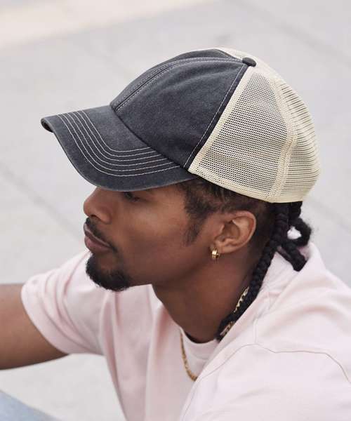 The 6-panel vintage trucker cap is edgy, with its hint of distressed retro styling. Made from heavy-washed cotton with recycled polyester mesh panels, it has a relaxed, unstructured crown and a curved peak for a classic look. Contrast stitching adds extra detail, while the snapback adjuster ensures a perfect fit. A timeless, laid-back piece with vintage appeal.