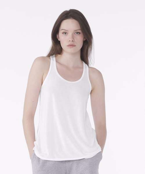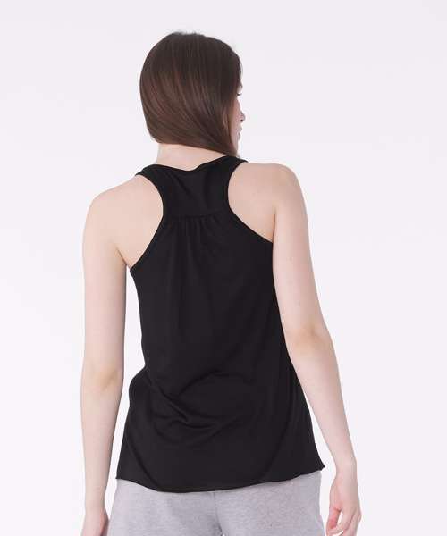 Merrowed bottom hem. Sheering at racerback seam. Racerback. Side-seamed. Easy, drapey fit.