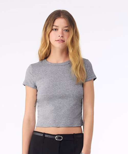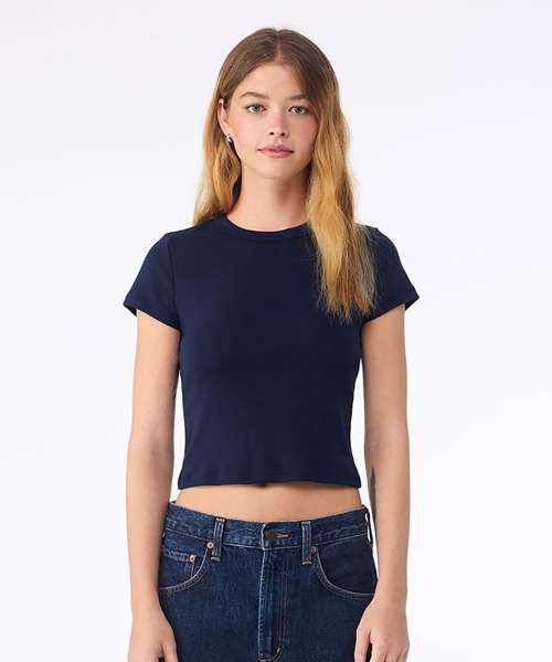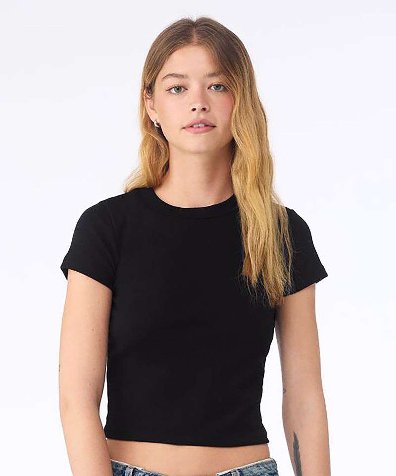 Crew neck binding. Mid-length. 1x1 micro rib. Fitted. Stretch fit. Set-in cap sleeves. Pre-shrunk. Side-seamed.