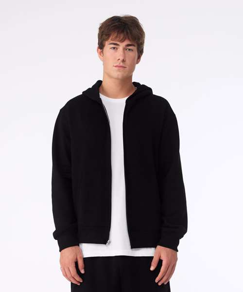 Three-end fleece. 60% Airlume combed and ringspun cotton, 40% polyester fleece. Full front zip. Silver metal finish. No drawcord. Structured fit. Unisex sizing. Double binding for a smart hidden zip finish. Side-seamed. Tear-away label.