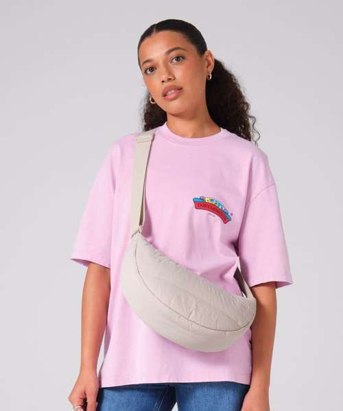 Soft, quilted fabric. Zipped main compartment. Two internal slip pockets. Lining with hidden zip access for decoration. Adjustable webbing cross-body strap. Tear-away label for ease of rebranding. Contains 100% GRS-certified recycled polyester, certified by Control Union CU811033.