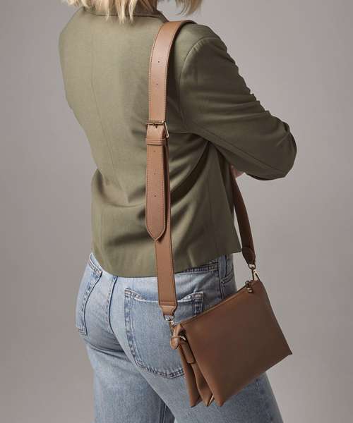 100% Leather-look PU. Saffiano fine grain. Internal pockets and dividers. Zipped main compartment. Zipped internal valuables pocket. Soft-touch lining. High-shine gold metal zip. Detachable adjustable shoulder strap. TearAway label for easy rebranding.