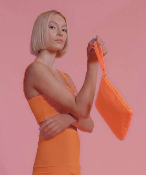 Premium fabric and finish. Bright colour pop palette. Zipped main compartment. Brushed gold metal zip and pull. Wristlet strap. Multipurpose use. TearAway label for ease of rebranding. Contains recycled polyester.