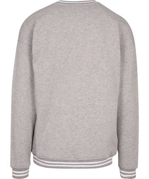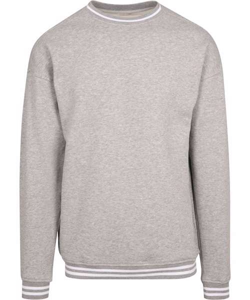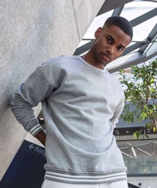 Overcut shoulders, ribbed cuffs at hem, neck and sleeve openings with college stripes, halfmoon at the neck.