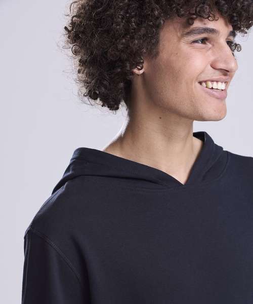 100% Organic hoody, with brushed inner and peached face. Kangaroo pocket, angled cuff detail and no drawcords for sleek look.
