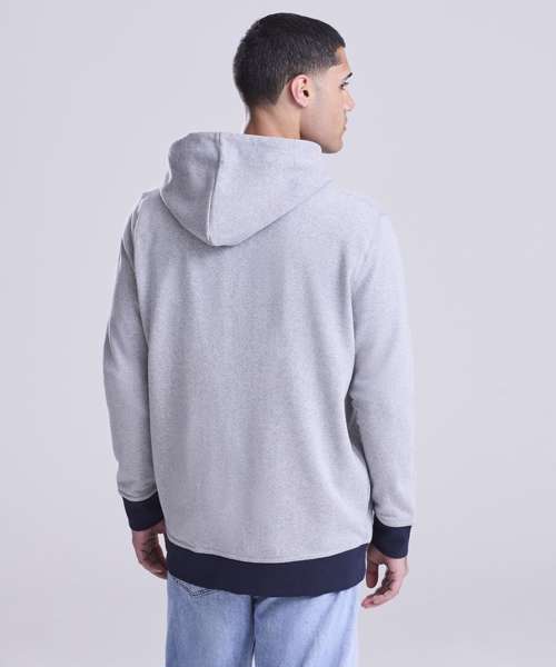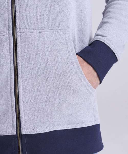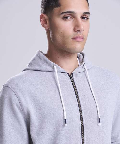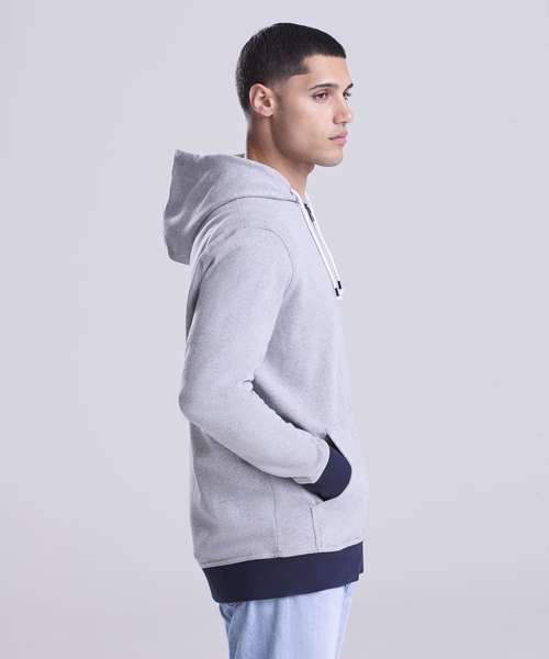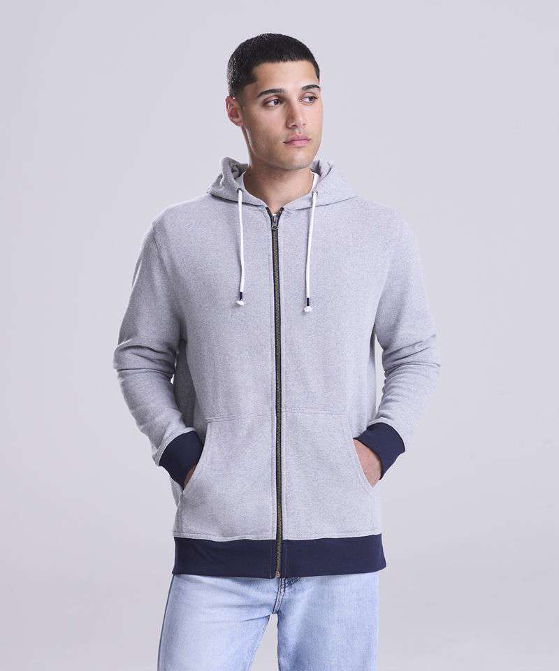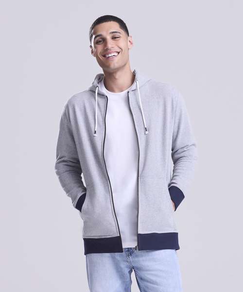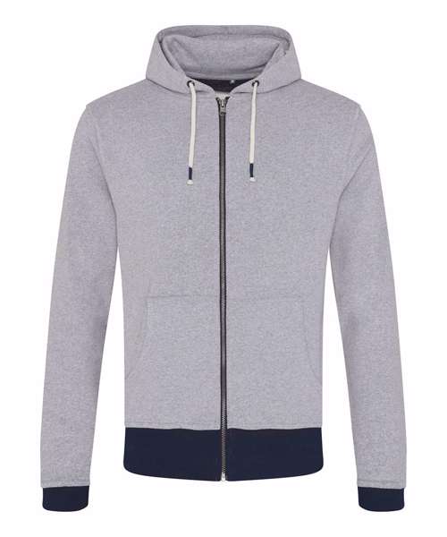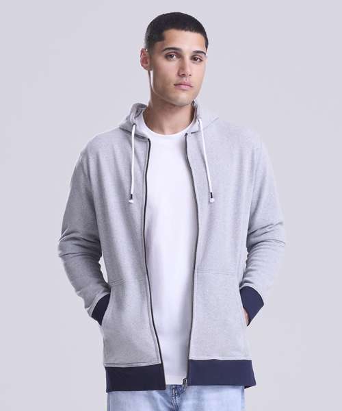 Long sleeve regenerated cotton zoodie with brushed inner and peached outer face. Features include set-in sleeves, contrast rib at cuffs hem, full length front zip and kangaroo pocket.