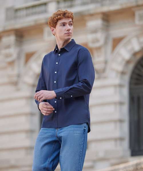 Regular fitting casual shirt with garment wash for subtle distressed look. Peached finish on fabric. Made from 100% organic cotton. Contrast pearlised buttons on the centre front and cuffs. Adjustable cuffs. Back yoke. Centre back box pleat. Outer hanging loop. Tag-free for easy rebranding.