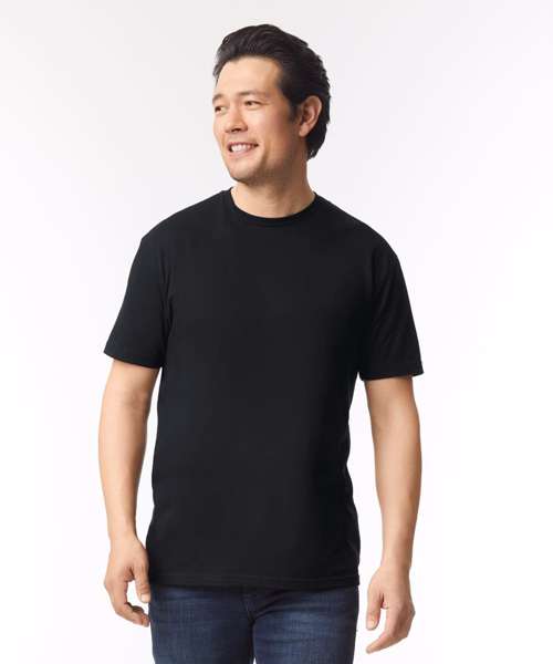 Made with our soft ringspun cotton blend, the Softstyle™ CVC adult t-shirt features high stitch density for a smoother printing surface. Soft ringspun fabric feels great against your skin. Non-topstitched, narrow width, rib collar. Taped neck and shoulders for comfort and durability. Modern classic fit, tubular body. High-performing black tear-away label.