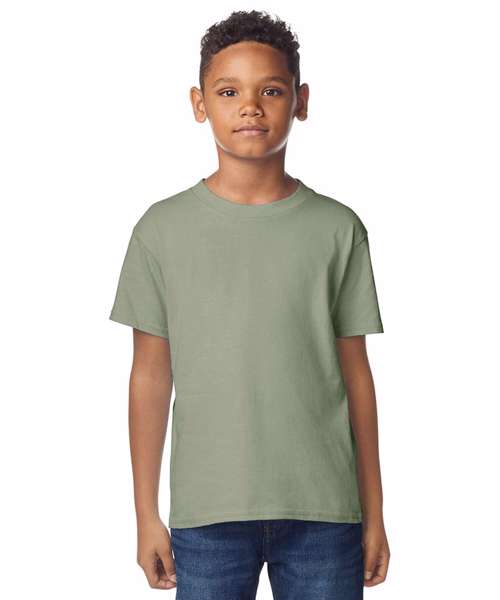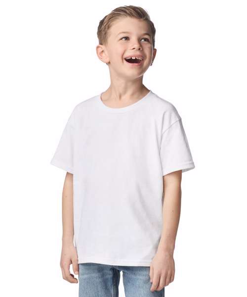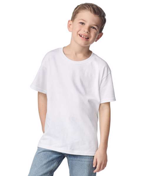Made with our soft ringspun cotton and cotton blends, the Softstyle™ midweight youth t-shirt features high stitch density fabric that offers a smooth printing surface, ideal for DTG. Soft ringspun fabric feels great against your skin. Non-topstitched, classic width, rib collar. Taped neck and shoulders for comfort and durability. Modern classic fit, tubular body – side seam on size Small. High-performing black tear-away label. CPSIA Tracking Label Compliant.