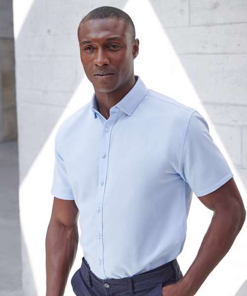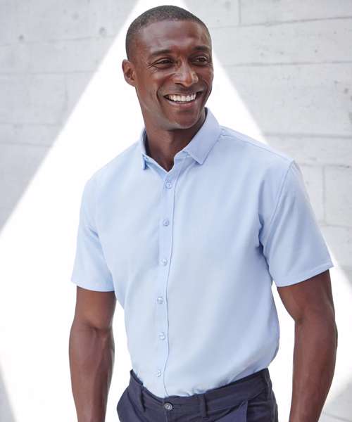 A men’s short-sleeved shirt that feels like cotton and performs like polyester. The exclusive 100% Coolplus® polyester shirting fabric is the new functional formalwear, providing cool comfort, all day.