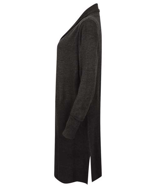 Fine knit, 12 gauge women's long line loose cardigan. Half ribbing detail on body and sleeves. Semi-fashioned sleeve. Henbury cut-out brand label. Co-ordinates with HB720 product range.