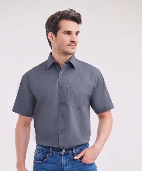 Smart and stylish shirt design in a fine poplin fabric. Classic style boned collar. Back yoke with 2 side pleats. Pocket over left chest mitred edge. Straight bottom hem. The elegant lightweight fabric is especially suited to finer embroideries.