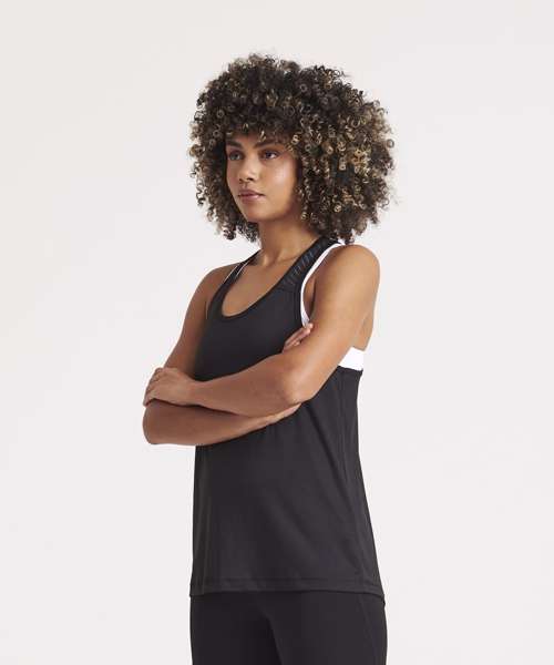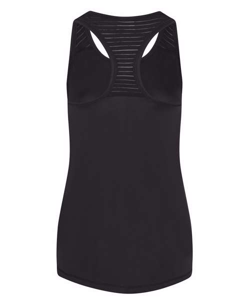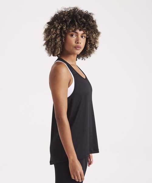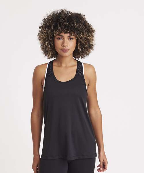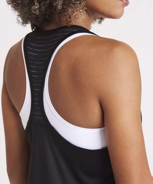 Girlie fit vest with mesh panel and racerback styling. Featuring high performance wicking fabric and dropped hem at back.