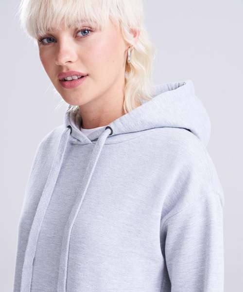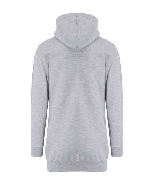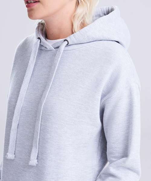 Women's relaxed fit. Longline cut design. Twin-needle stitching detail. Double fabric hood. Flat lace drawcords. Kangaroo pouch pocket. Soft cotton faced fabric creates ideal printing surface. Simple tear-out label makes it perfect for rebranding. Brushed inner fleece.