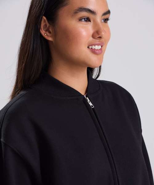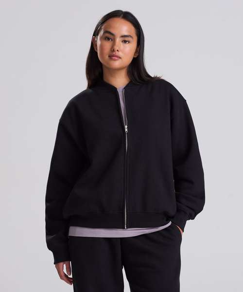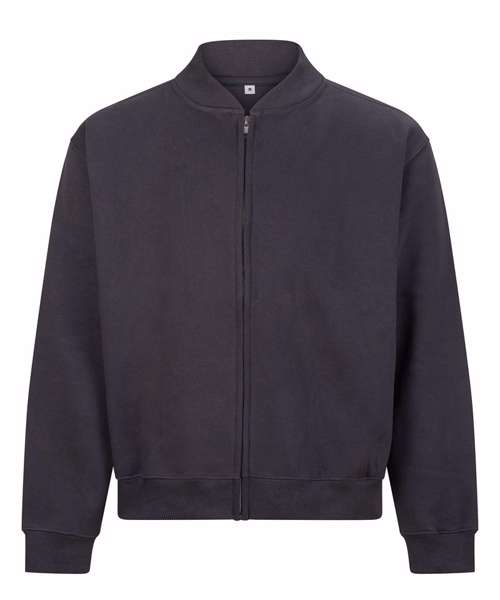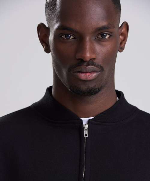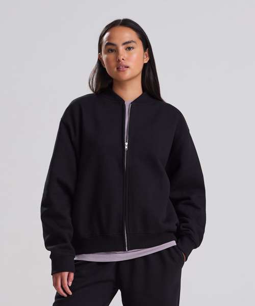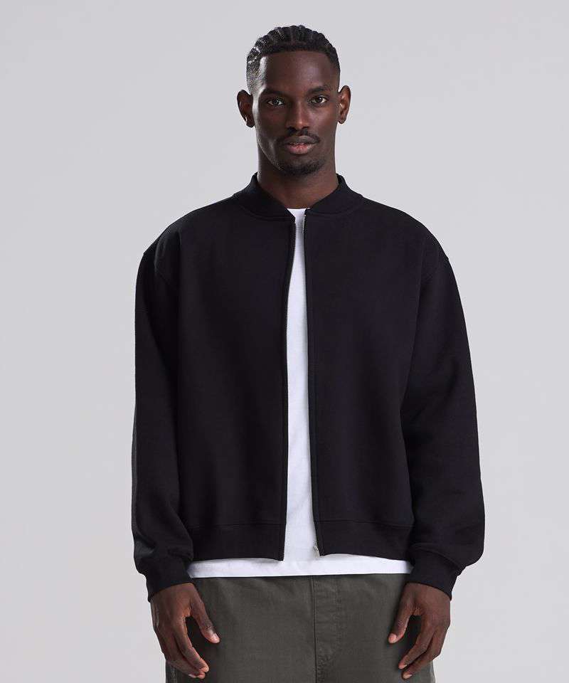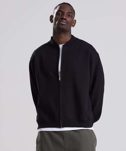 The Signature heavyweight bomber sweat is designed with a modern oversized fit and boxy unisex shape. Built from 100% cotton-faced fabric for sharp prints, with a brushed inner fleece for warmth, it blends comfort with a premium finish. Details include a YKK silver zip, 2x1 ribbed collar, ribbed cuffs and hem, plus features such as a locker patch for rebranding and a practical hanging loop. Completed with a size label only, it’s the perfect base for branding. Made with recycled polyester.