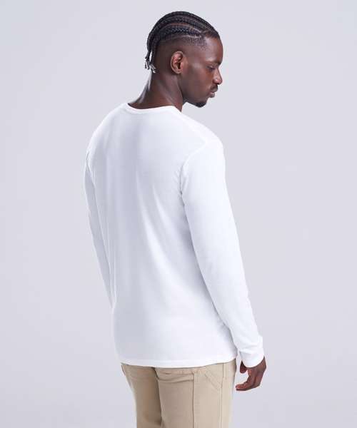 Modern fit long sleeved T. Size tab label. Triblend fabric for style and comfort. Taped neck. Twin-needle stitching on sleeves and bottom hem. Ribbed crew neck style. soft-feel fabric. Side seams. Set-in sleeves.