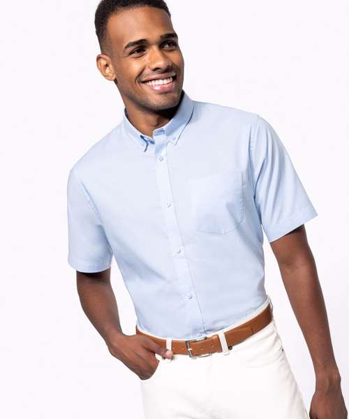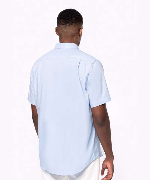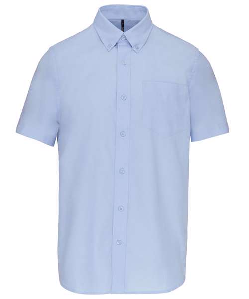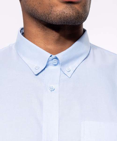 70% Oxford cotton/30% polyester. Easy-care fabric. Button down collar. Matching buttons. V-shaped left chest pocket. Double back yoke with 2 side pleats. 2 spare buttons. Shaped hem. Certified STANDARD 100 by OEKO-TEX® N° CQ 1007/7, IFTH.