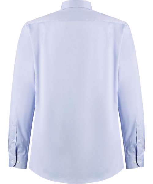 Fused stand-up button-down collar with contrast inner collar stand. Contrast binding down the centre of button placket. Rounded hem. Double-stitched side and sleeve seams. Single-stitched yoke and armholes. One-button adjustable cuff (with option for cufflinks) with buttoned cuff placket. Spare buttons. Kustom Kit® woven back neck label.