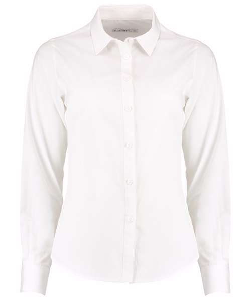 Fused soft stand up collar (no stiffeners) collar. 7-button placket with self-coloured buttons. Rounded hem. Single stitching around armholes. Double-stitched sleeves and side seams. Back yoke. Adjustable 2 button cuff with pointed no button cuff placket. Under bust darts. Back darts from hem to under arm point. Spare button. Kustom Kit® woven back neck label.