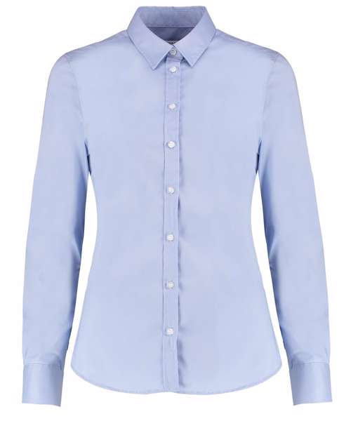 Fused stand-up collar. Two darts at the back. Two bust darts to the front. Rounded hem. Back yoke. Adjustable cuff with buttoned cuff placket. Spare button. Kustom Kit® woven back neck label.