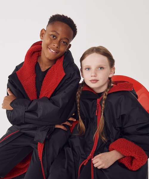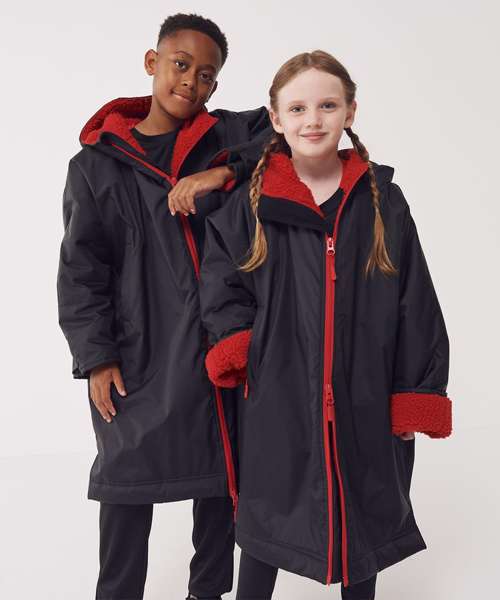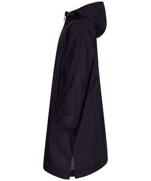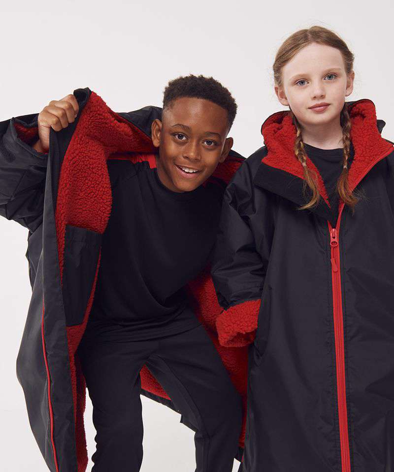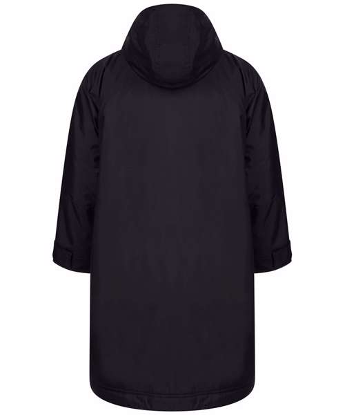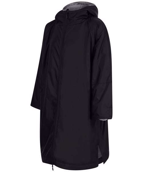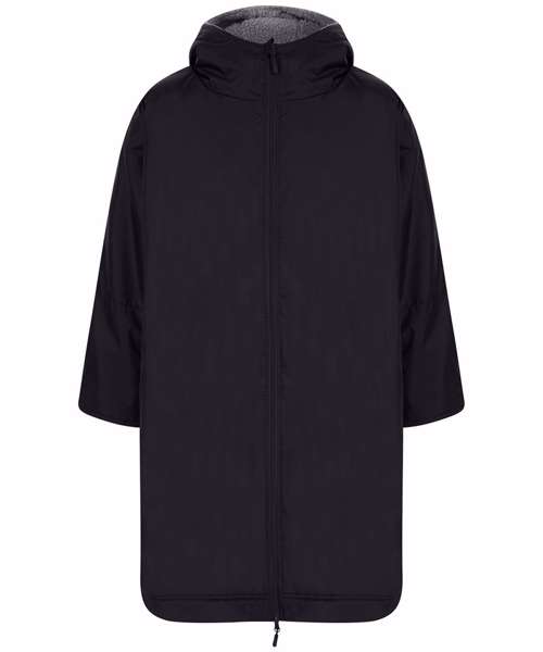 The ultimate team robe is made in a water resistant fabric with a cosy sherpa fleece lining and three-piece hood. The roomy fit with double-ended full front zip allows wearers to keep warm and get changed underneath the robe. Perfect for wild swimming or wearing on team sidelines. Zipped pockets with fleece lining keep hands warm with multiple inner pockets for keeping belongings safe. Topped off with a large embroidery zip for access to directly decorate.
