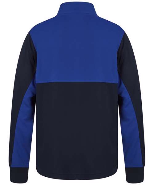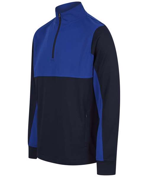 Contrast upper chest and underarm panels. Quarter zip. Side panels. Reverse nylon zips centre front and side pockets. 1x1 ribbed cuff sleeve. Semi-automatic zip pull and slider.