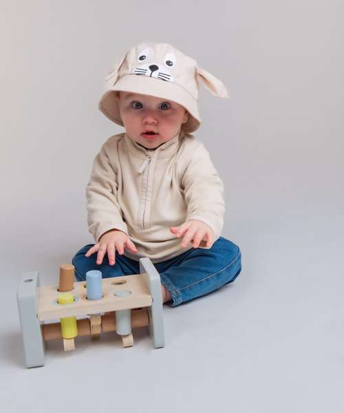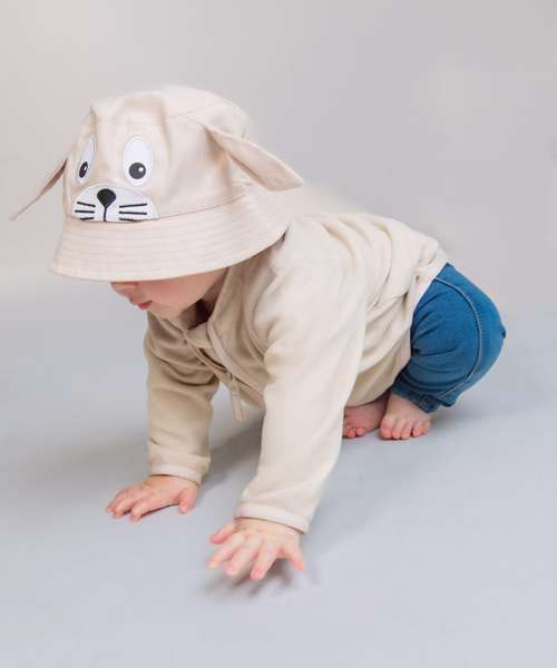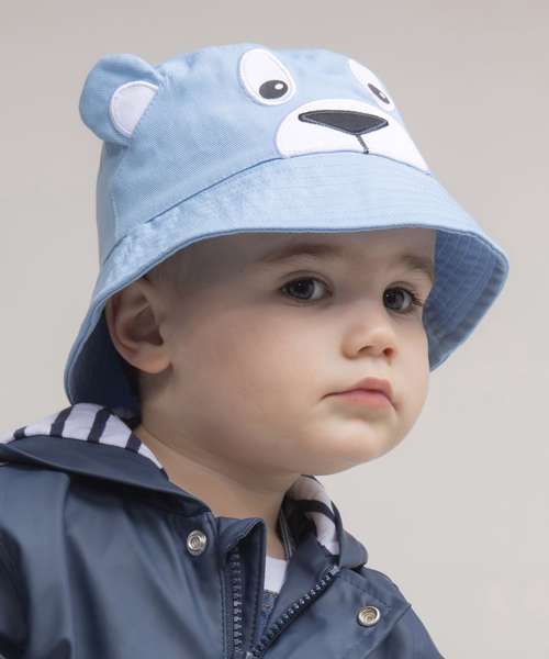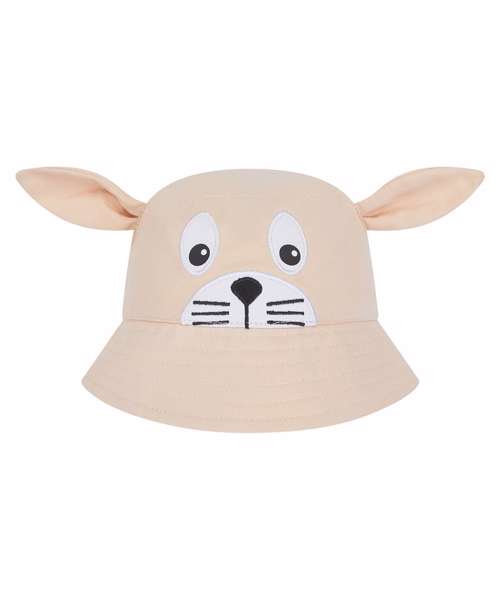 Kids bucket hat with embroidered character facial features. Two colourways in different animal styles. Top-stitched brim detail. Flat top. Elasticated back. Suitable for decoration.