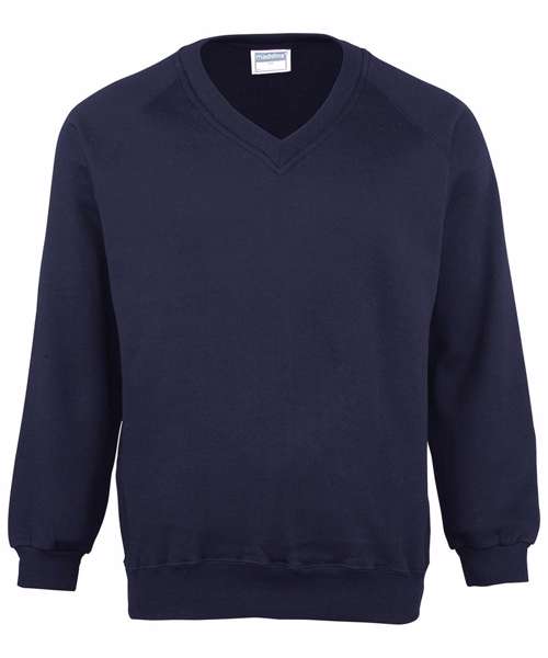 Easycare v-neck raglan sweatshirt with cover seamed mitred V, welt and raglan. Herringbone taped neck. Also available in kids.