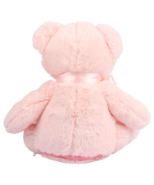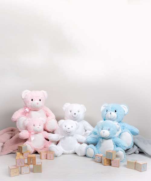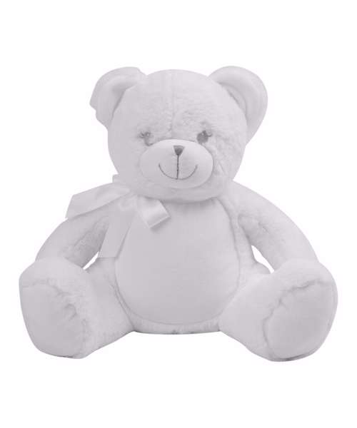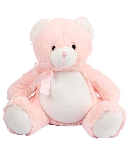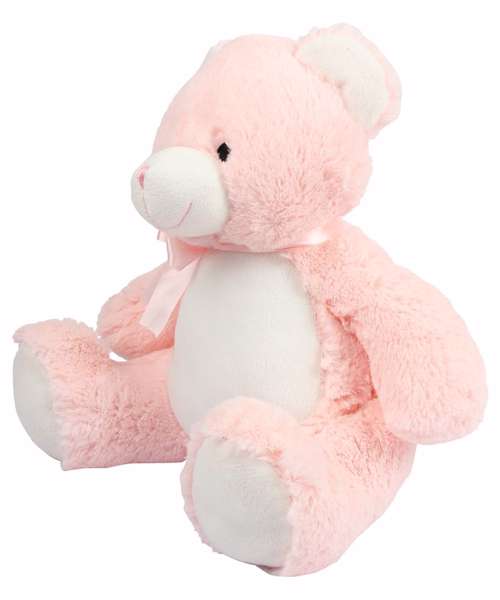Soft plush bear. Contrast cream nose, front panel, and paws. Sewn nose and eyes. Matching ribbon and bow. Zip access on the base of the bear for direct access onto the tummy for decoration. Removable inner stuffing. Can be embroidered or sublimation printed. Complies with EN71 European Toy Safety regulations. Remove all hang tags and their fasteners before giving these items to a child. Suitable for children of all ages.
