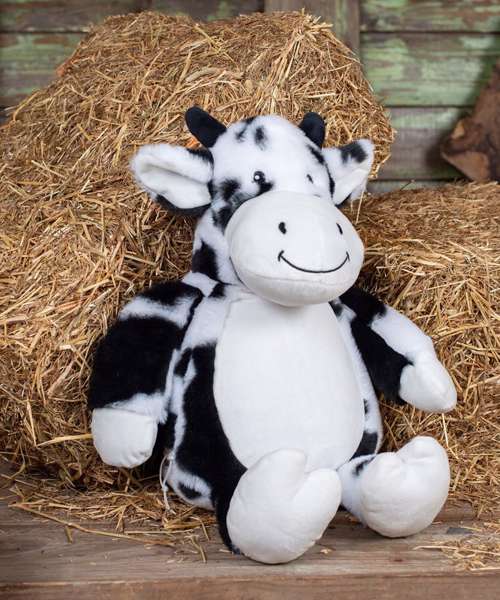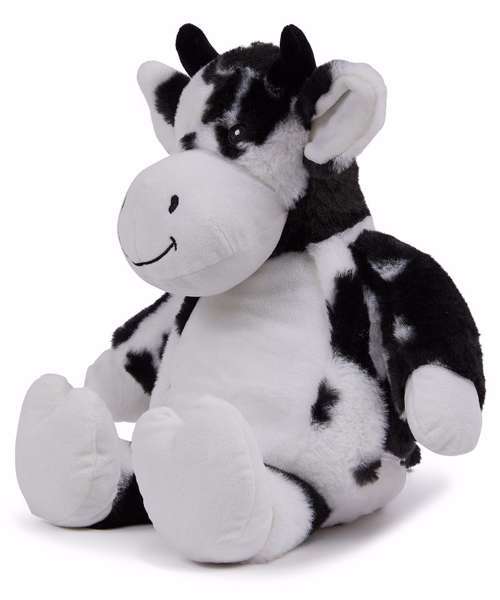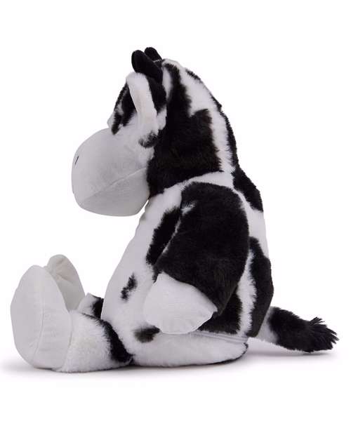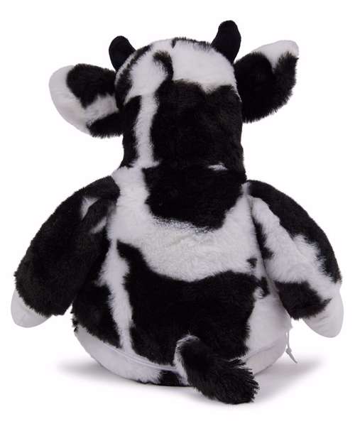 Soft plush Zippie cow with contrast face and hooves. Sewn eyes and mouth. White panel on tummy, perfect for decoration. Zip access on base for direct access onto the tummy for decoration. Removable, separate inner head and body stuffing. Can be embroidered, vinyl, and sublimation printed. Complies with EN71 European Toy Safety regulations. Remove all hang tags and their fasteners before giving this item to a child. Suitable for all ages.