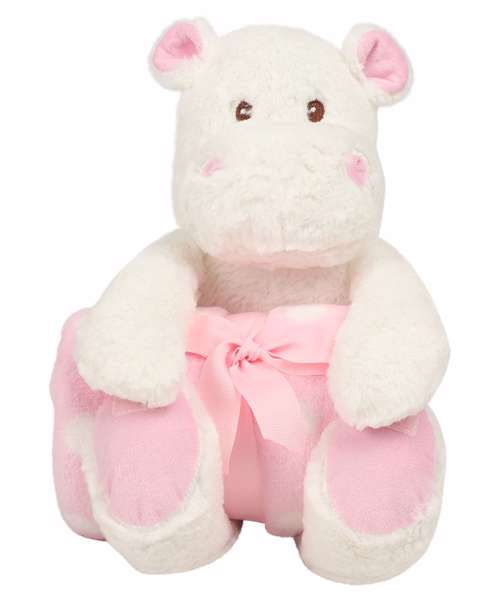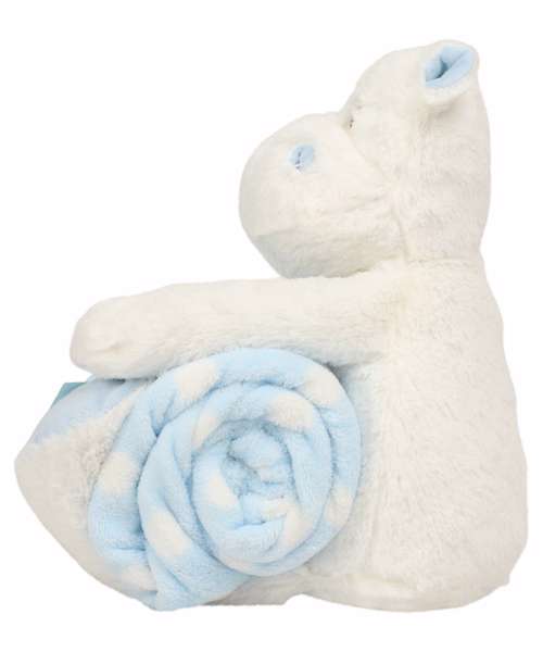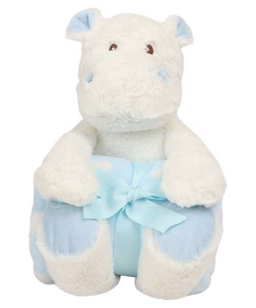 Soft plush hippo with contrast blanket. Contrast feet, nose, and horns. Sewn eyes. Hook and loop fastening on feet and paws. Blue and white spotted velour blanket. Complies with EN71 European Toy Safety regulations. Remove all hang tags and their fasteners before giving these items to a child. Suitable for all ages.