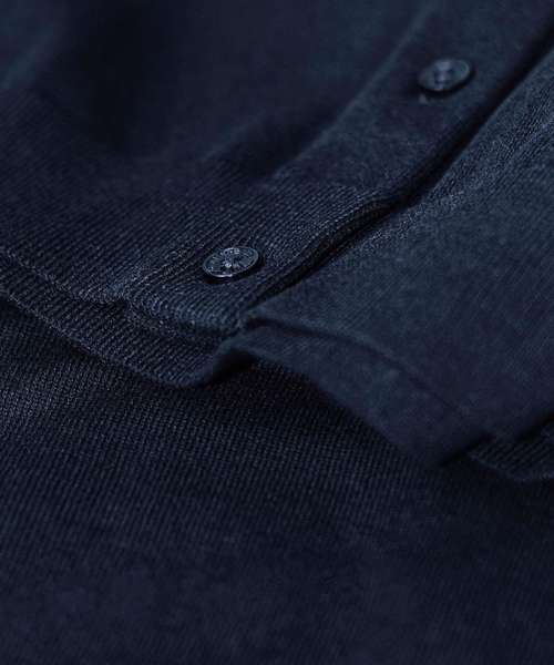 Certified organic cotton. Fine-gauge knit. Excellent shape retention. Feminine round neckline and elegant tone-in-tone buttons. Rib at neck, sleeves and bottom hem.