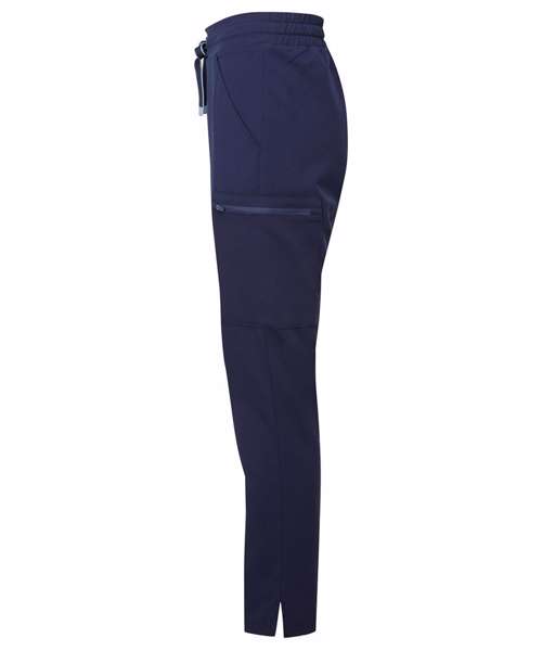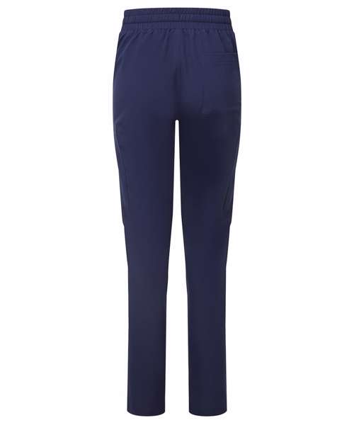 Women’s cargo scrub pants. Comfortable four-way stretch. Breathable, easycare, crease-resistant fabric. Part-elasticated waistband with adjustable drawcord and mock fly. Multiple mobile-friendly coin and zip pockets. Hemmed side vents. Decorate with embroidery and/or print. Contains certified recycled polyester.