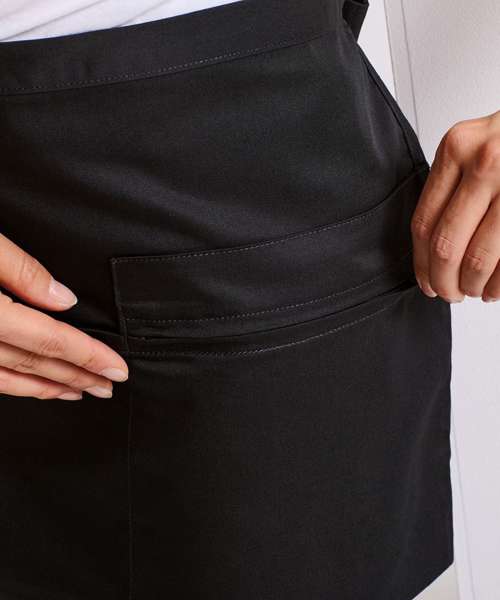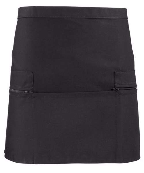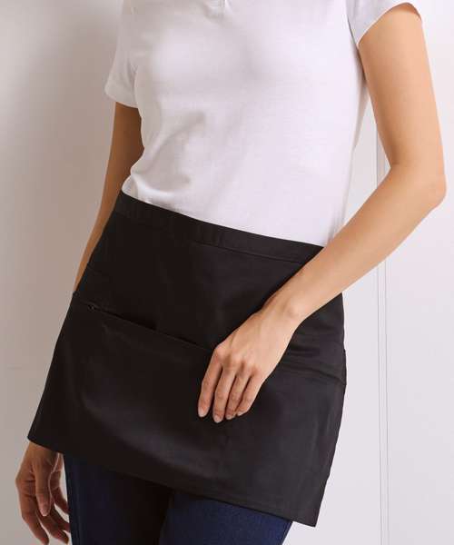 A short waist apron featuring two side zip pockets and one open centre pocket that is ideal for carrying tablet devices. A popular style of apron for waiting-on staff which is made from a durable polycotton fabric to withstand repeated washing.