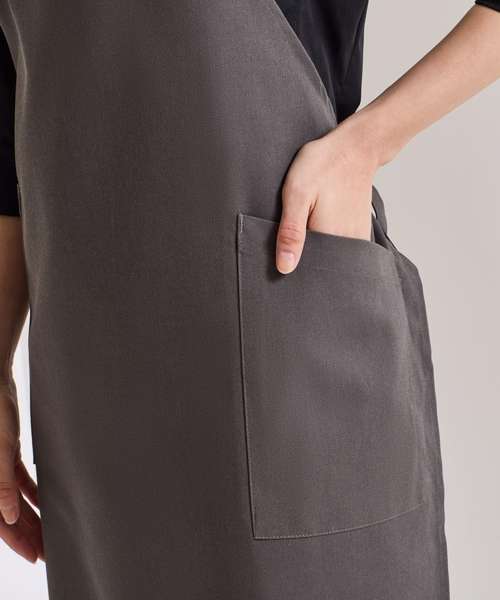 A heavyweight full length bib apron made from a combination of certified recycled polyester and certified organic Fairtrade cotton. Featuring two slanted side pockets and fully height adjustable with a buckle on the neckband. Two slanted side pockets measuring 24cm depth by 18cm wide. Adjustable buckle with gun metal finish. 86cm long x 72cm wide with 90cm long ties.