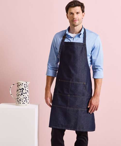 Denim bib apron with contrast stitching. Adjustable buckle on the neckband. Copper rivets. Four pocket compartments. 86cm long and 72cm wide.