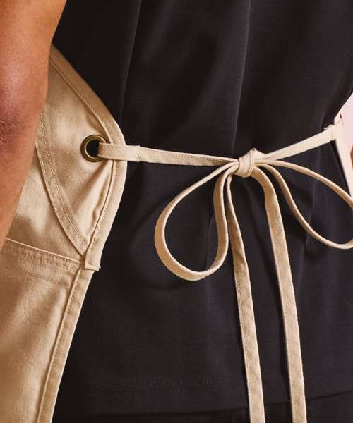 Heavyweight canvas bib apron that can also be folded down to form a half-waist apron. Rounded edges. Gunmetal/antique brass eyelets. Mitred double pocket. Adjustable knotted neckband and matching waist ties that can be fastened to the front or back. Cotton-rich with certified recycled polyester.