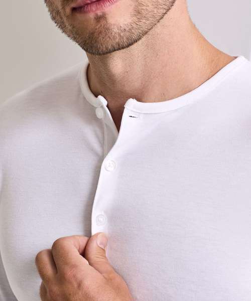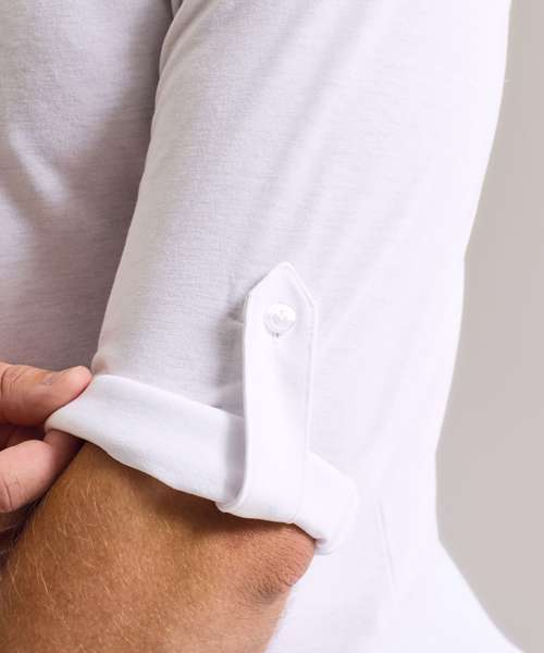 Long sleeve tee that has roll sleeve capabilities with button tab on the inside of the sleeve to secure in place. Round neck style with three a button placket. Twin-needle stitching to the hem and cuff.