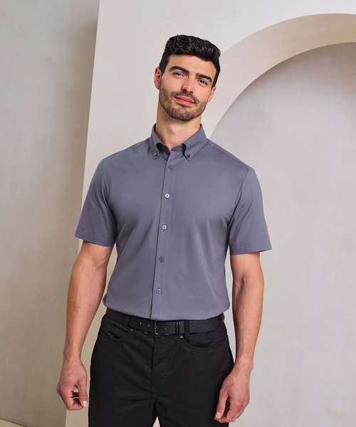Short sleeve shirt in mercerised cotton, which enhances its overall look, feel and performance. Contains organic cotton and elastane for stretch and shape. Button-down collar. Self-coloured buttons with pearlised buttons on white. Back yoke for fit over the shoulders and back pleats to assist the shape. Curved hemline.