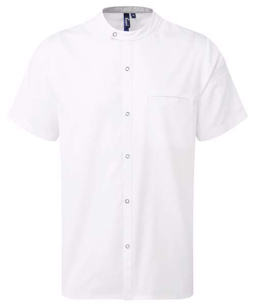 Lightweight short sleeve chef’s shirt made with certified recycled polyester. Mandarin banded collar and press stud closure. Contrast inner neckband. Two pen pockets on left arm. Welt pocket to front left chest with combined pen pocket and faux top stitching. Pocket bag can be moved to allow for embroidery. Back yoke with pleats for ease of movement through chest and shoulders. Press stud tab to the back for hanging or securing an apron in place. Reinforced side seams.