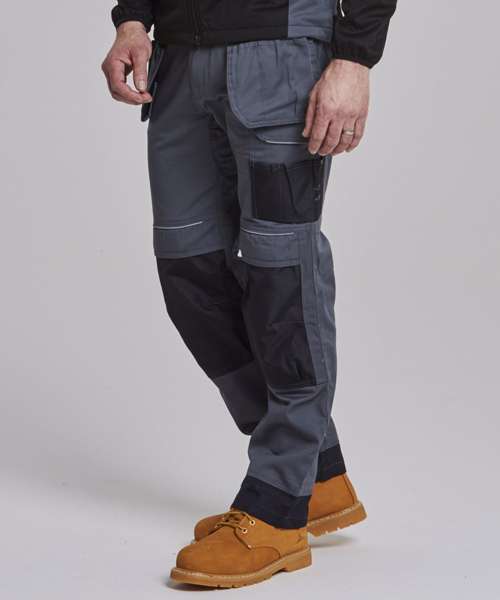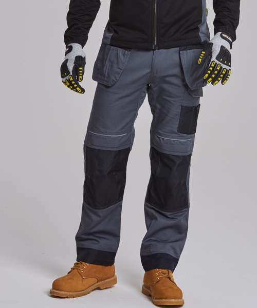 Contrast colour stitching. Contrast panels. Double rule pocket. Hammer loop. Reflective piping. Side pockets. Triple-stitched seams. Two back patch pockets. UPF 50+. Side elastic waist. Holster pockets. Gripper elastic on inner waist. Top-loading knee pad pockets. Smart phone pocket. D-ring. 12-pockets. Cargo pocket on side leg. Adjustable leg length. Reinforced panels . Durable polycotton fabric.
