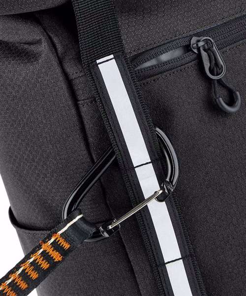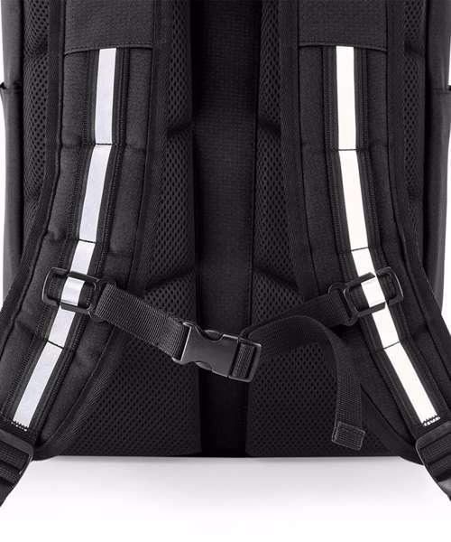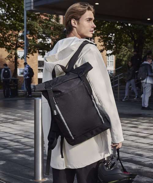 Low-profile streamlined design. Weather-resistant roll-top closure. Glove-friendly metal buckles. Quick-access zipped front pocket. Two external bottle pockets. Padded internal laptop sleeve, compatible up to 15.6". Enhanced-visibility reflective stripes. Ergonomic, breathable padded mesh back panel. Ergonomically designed straps for everyday comfort. Fully adjustable chest strap. Durable, water-repellent treatment for increased weather protection. PVC-Free. TearAway label for ease of rebranding. Reach certified.