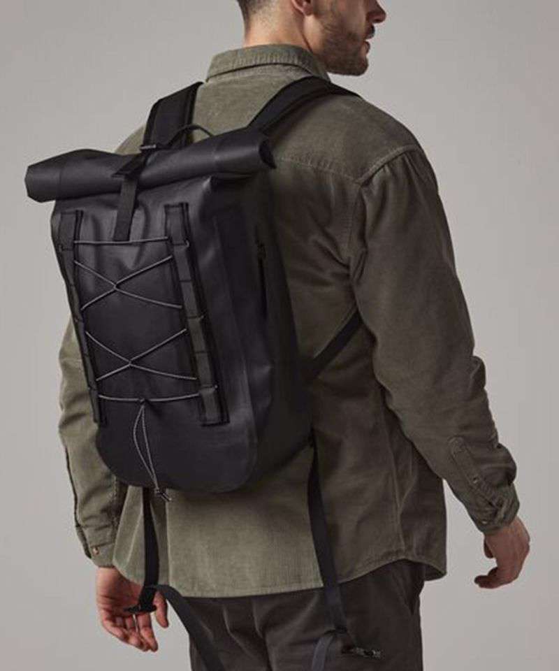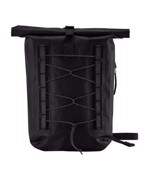 Waterproof fabric. Webbing attachment loops with reflective accents. Waterproof main compartment. Front bungee attachment. Zipped side pocket. Roll-top closure. Padded, adjustable shoulder straps. TearAway label for ease of rebranding. Contains recycled polyester.