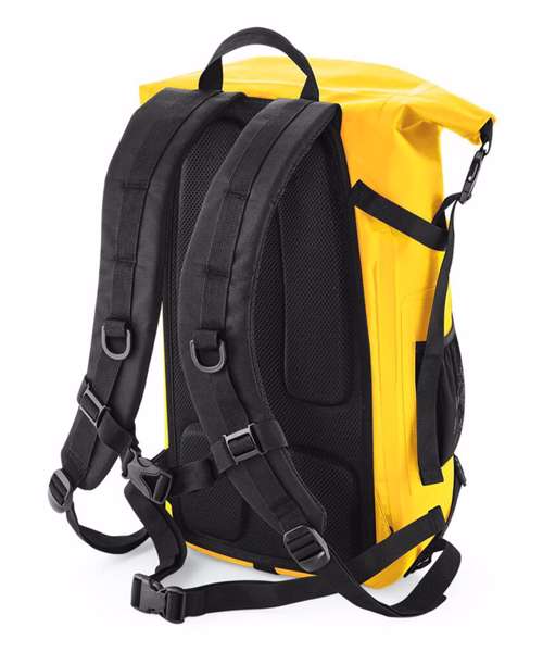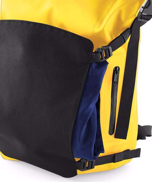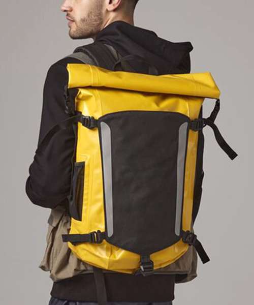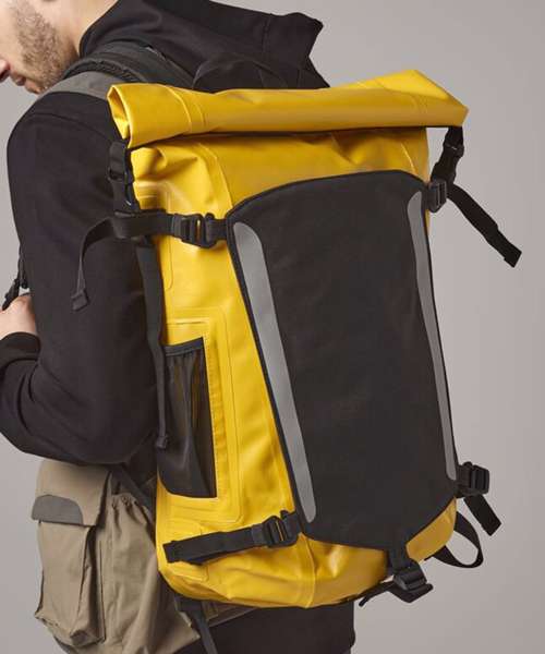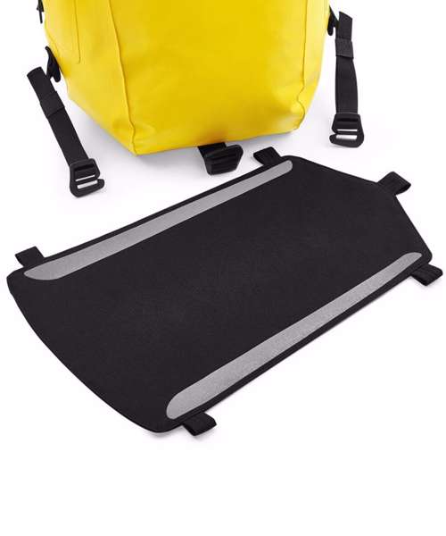 Secure roll-top and clip closure system. Waterproof Zip. Dual sided EasyPanel™ for decoration. TearAway adhesive fabric label. EasyPanel™ for decoration. Innovative, tough durable design. Compression straps. Enhanced visibility reflective accents. External mesh pocket. Ergonomic breathable padded mesh back panel. Padded adjustable mesh shoulder straps. Grab handle.