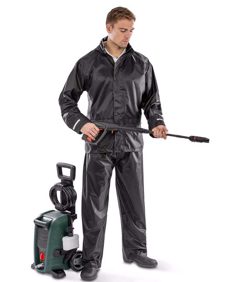 Jacket: Concealed hood in collar. Full front zip fastening. 2 spacious front pockets. Inner back mesh vent. Inner elasticated storm cuff. Stud closing front storm flap. Full-taped seams. Adjustable drawcord hem. Trousers: Fully taped seams. Elasticated waistband. 2 side pocket slits to access garment being worn underneath. Adjustable snap closing ankles. Waterproof 2000mm Windproof. Decorating methods: Digital transfer print, direct print.